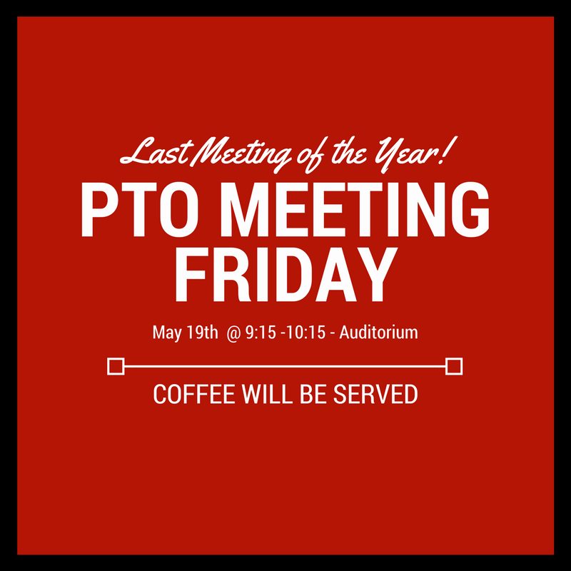 Please join the PTO this Friday, May 19th from 9:15 – 10:15 am in the school auditorium.  This will be our last general meeting of the 2016-2017 school year. Items on the agenda include: