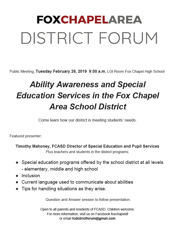 The next public meeting will be held Tuesday, Feb 26th at 9:00 a.m. Tim Mahoney, Director of Special Education and Pupil Services will be sharing information on Ability Awareness and Special Education Services.