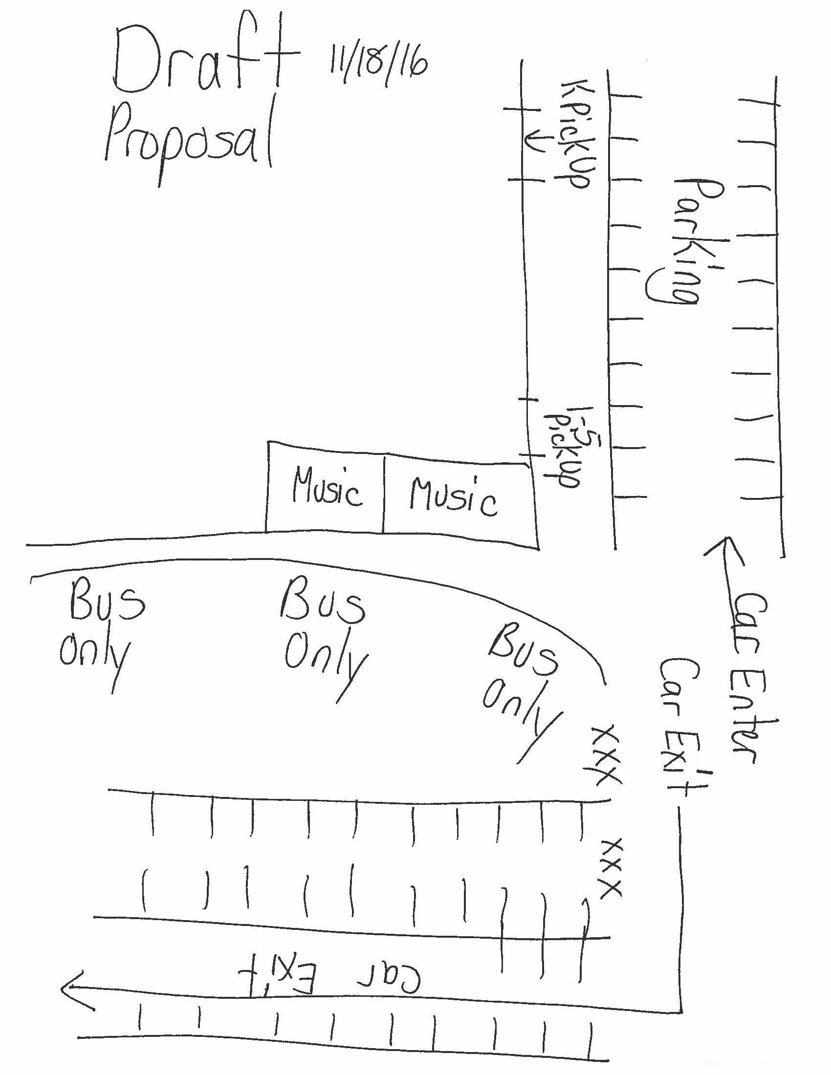 Mrs. Batis shared that her initial impression of O’Hara is positive – the school is safe, secure and welcoming.  However, she and Mr. Edwards have observed some potential areas for improvement.  Their first initiative is to address the current dismissal process for car riders. Mrs. Batis, who is trained in FEMA emergency planning,  said that there is currently a lot of  “cross-over” traffic, with students and parents walking in front of buses to get to the parking lot. This cross-over traffic creates a potential safety issue. Mrs. Batis has proposed lessening the cross-over traffic by having car riders picked up from exits on the side of the school. Here’s a sketch of the proposed change provided by Mrs. Batis.